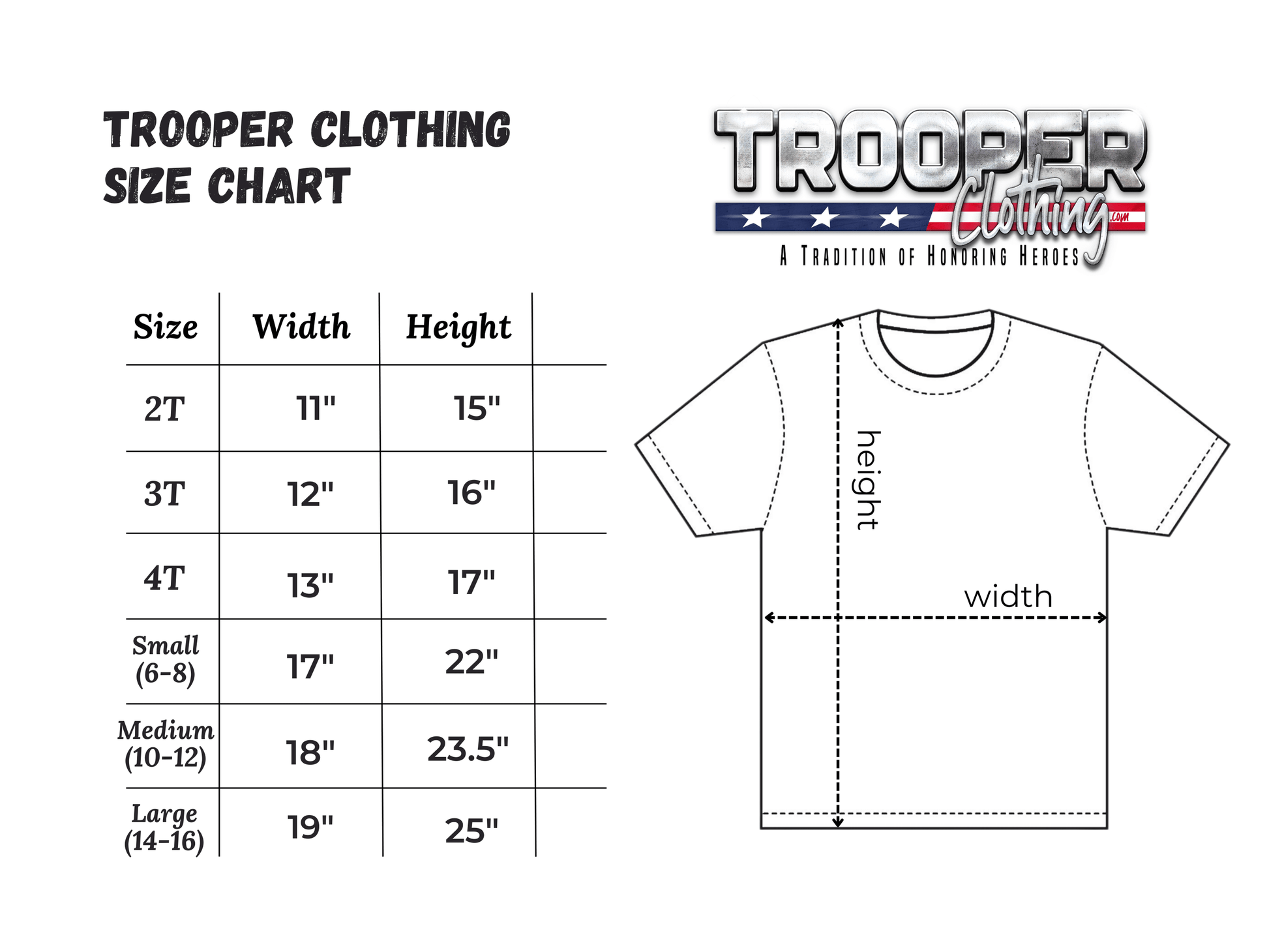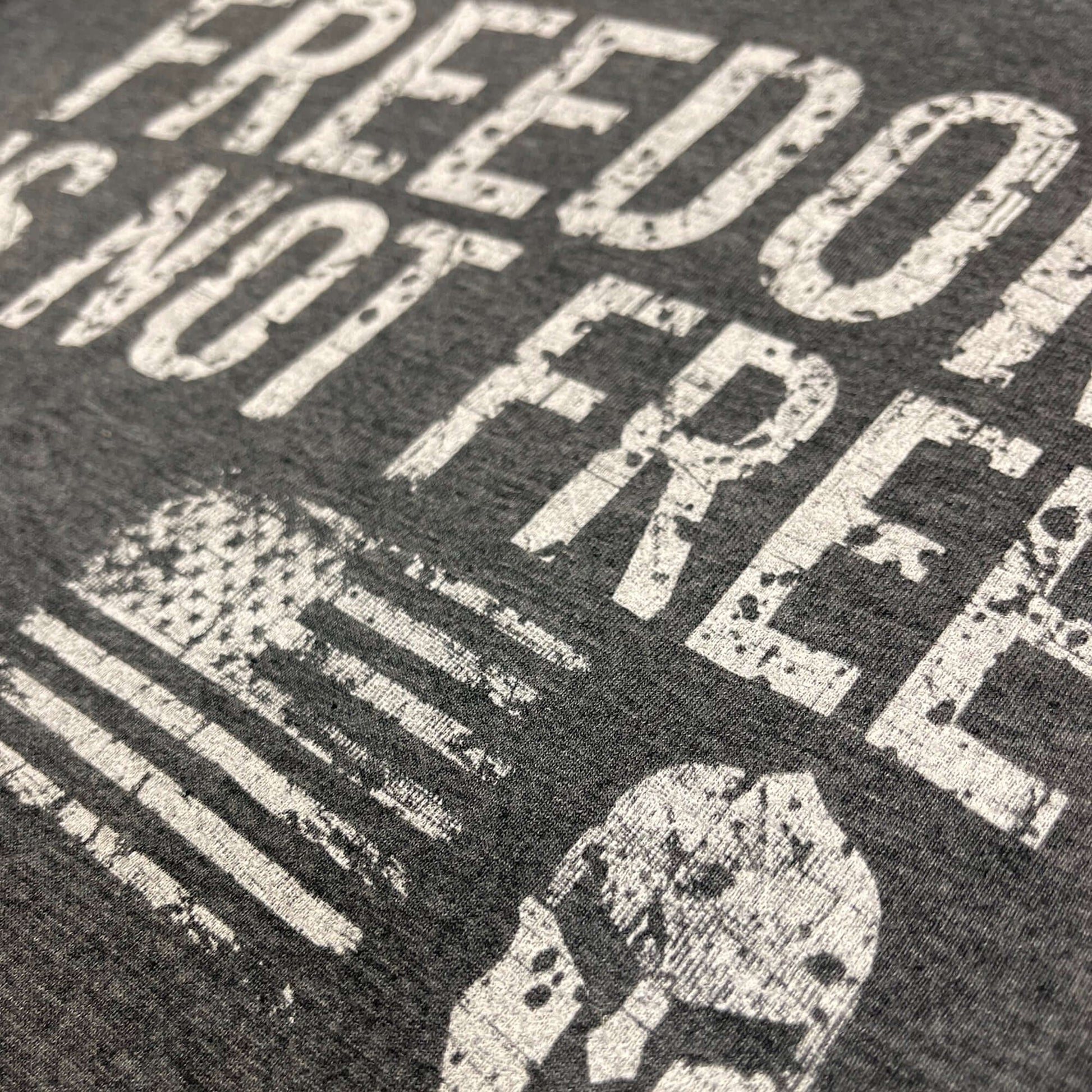 Trooper Freedom Is Not Free logo youth T-shirt is boldly screen printed on a 6.5 oz graphite jersey gray performance tee. The shirt proudly features a bold Freedom Is Not Free logo, distressed flag, and spartan logo. An American flag is printed on the left sleeve. Kids love these patriotic tees!